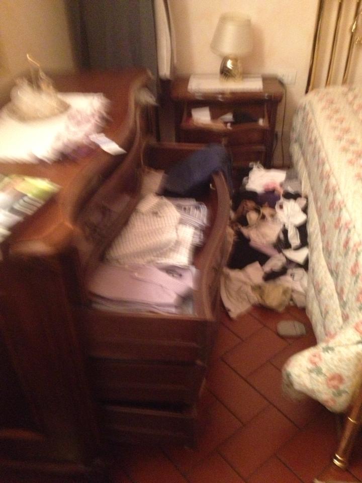 Come si vede dalle foto e come ci spiega il derubato, "hanno buttato all'aria tutta la casa. hanno rubato due televisori, due computer, una Playstation, un giubbotto a mia madre, 100 euro da un mio cassetto in camera".