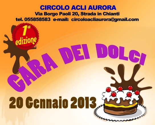 Domenica 20 Gennaio alle 15 presso il circolo Acli Aurora di Strada in Chianti avrà luogo la prima edizione della gara dei dolci. I dolci saranno premiati per la bontà e la bellezza nella presentazione.