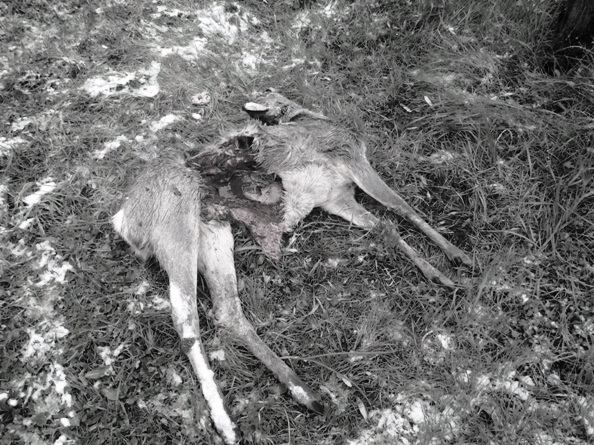 Avevamo dato la notizia nei giorni scorsi e adesso, grazie alla proprietaria del terreno sul quale è stata rinvenuta la carcassa, possiamo documentarla anche con una fotografia (che abbiamo trasformato in bianco e nero per rendere meno "cruenta").