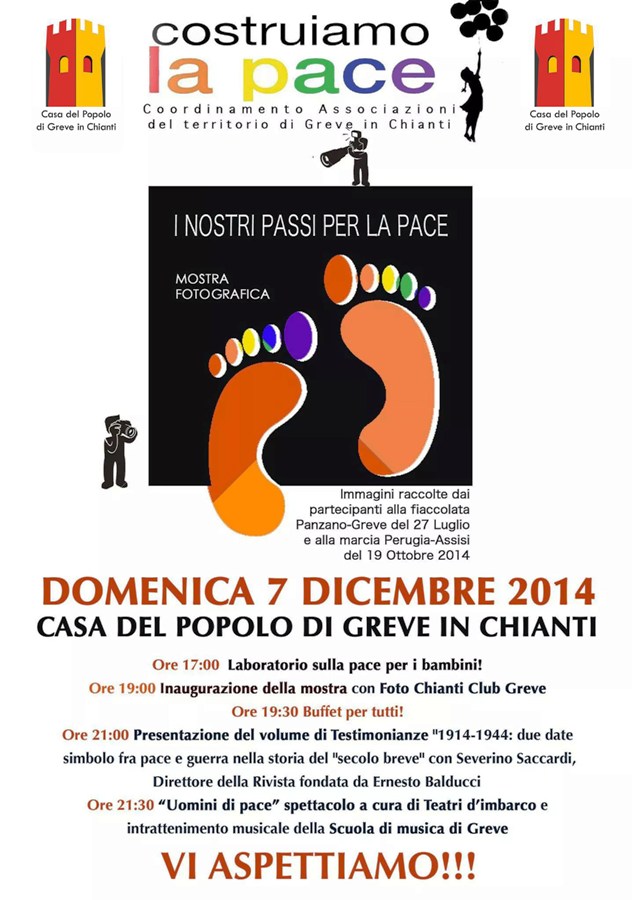 Domenica 7 dicembre presso la casa del popolo di Greve in Chianti avrà luogo l'inaugurazione della mostra fotografica "I nostri passi per la Pace" con le immagini raccolte dai partecipanti alla fiaccolata del 27 luglio e alla marcia Perugia-Assisi del 19 ottobre, cui hanno partecipato tre pullmann pieni di cittadini del comune grevigiano.