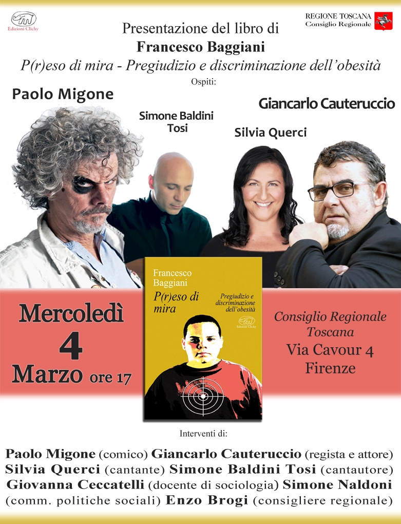 Stiamo parlando dei pregiudizi e delle discriminazioni attorno all'obesità giovanile. Un tema affrontato con lucidità, coraggio e grande delicatezza dal grevigiano Francesco Baggiani, che con il suo libro "P(r)eso di mira – Pregiudizio e discriminazione dell’obesità" (edizioni Clichy), ha sollevato un velo sottile ma sempre presente.