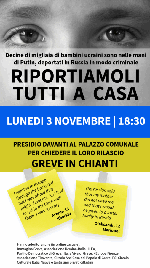 GREVE IN CHIANTI – Lunedì 3 novembre alle ore 18.30 è stato organizzato un presidio davanti al palazzo comunale di Greve in Chianti per chiedere la restituzione dei bambini ucraini rapiti dal regime di Putin e deportati in Russia.