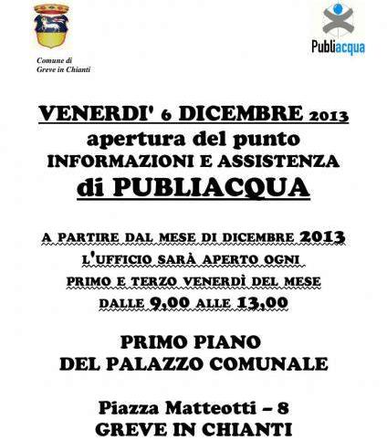 GREVE IN CHIANTI – Publiacqua e Comune di Greve in Chianti aprono un punto informazioni dedicato ai cittadini del territorio. Sarà ospitato in un ufficio del palazzo comunale e sarà aperto ogni primo e terzo venerdì di ogni mese a partire dal venerdì 6 dicembre.