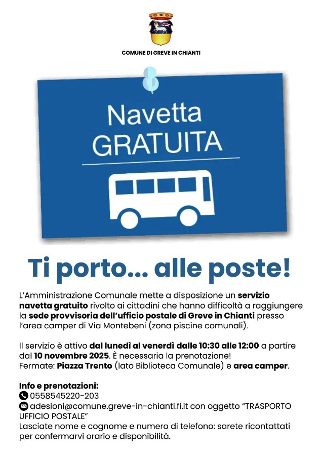 Info e prenotazioni: 0558545220 – 0558545203; adesioni@comune.greve-in-chianti.fi.it, specificando nell’oggetto “TRASPORTO UFFICIO POSTALE”.