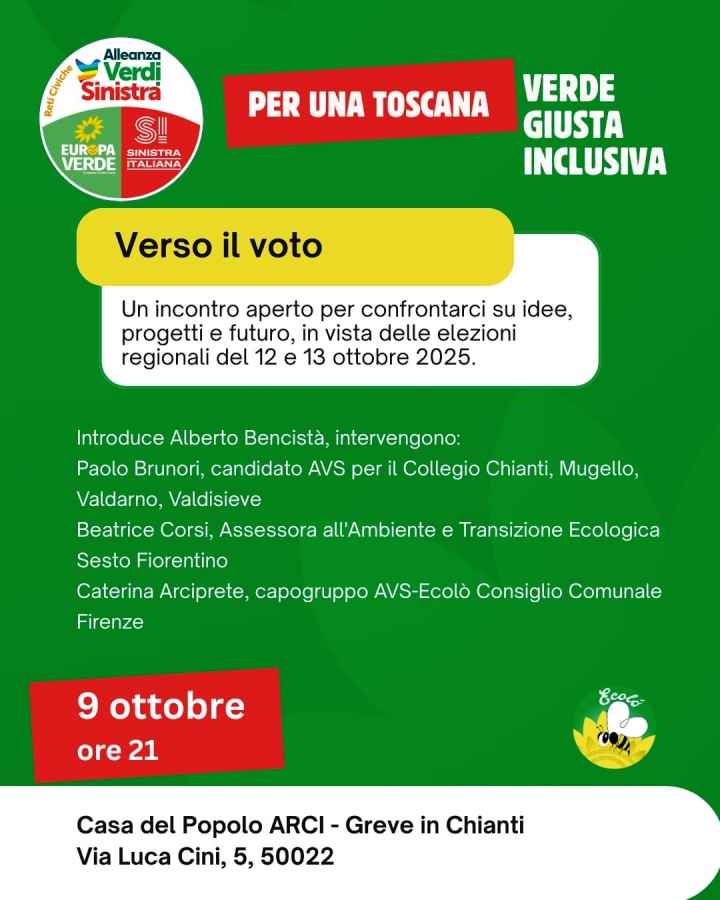 GREVE IN CHIANTI – Si terrà giovedì 9 ottobre, dalle 21 casa del popolo di Greve in Chianti, l’incontro con il candidato nella lista AVS (Alleanza Verdi Sinistra) nel collegio Firenze 2 (Chianti, Mugello, Valdarno, Valdisieve) Paolo Brunori.