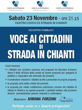 STRADA (GREVE IN CHIANTI) – E' stato chiamato "Voce ai cittadini di Strada in Chianti" l'evento che si terrà presso il Centro civico di Strada in Chianti sabato 23 novembre alle 21.15.