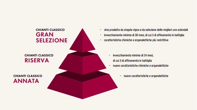 Proviamo a declinarne alcuni aspetti e precisamente: la costruzione di una piramide di qualità, qual è ora la nuova struttura impostata del disciplinare del Chianti Classico, distinto tra annata, Riserva e Gran Selezione, sradica la pianta madre monolitica del monoprodotto e trasferisce sul piano della strategia di differenziazione la possibilità di rivolgersi a target diversi di consumo, colmando quel area di vertice della piramide che ad oggi era presente solo nelle etichette aziendali icone delle denominazione.