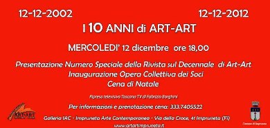 Si terrà la presentazione del numero speciale per il decennale della rivista Art-Art, l'inaugurazione della mostra colletiva dei soci e, a chiusra, una bella cena in cui scambiarsi gli auguri. Il tutto ripreso dalle telecamere di Toscana Tv con il coordinamento di Fabrizio Borghini.