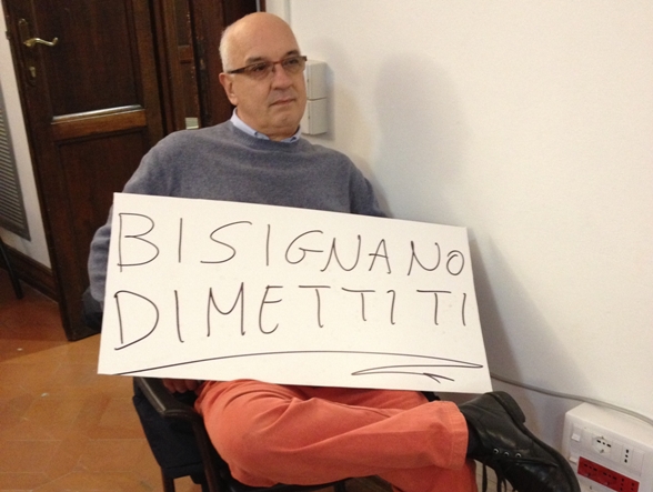 Che, fedele anche a una vena creativa che non gli ha mai fatto difetto, si è presentato al consiglio comunale di giovedì 7 febbraio con tanto di cartello con su scritto "Bisignano dimettiti" (vedi foto). Fra lo stupore di giunta e dei consiglieri comunali stessi. Solo che Bisignano… era assente. Ma Viti non demorde: è convinto che quel posto in consiglio non spetti a chi ha deciso di lasciare quell'esperienza politica. Alle elezioni amministrative mancano ancora alcuni mesi, ma il clima è ormai arroventato oltre ogni limite… .