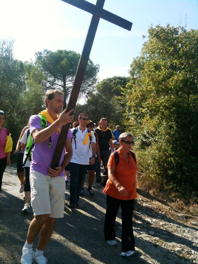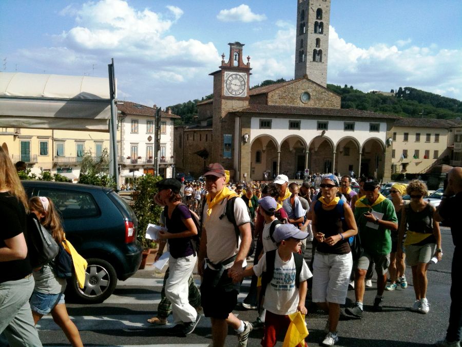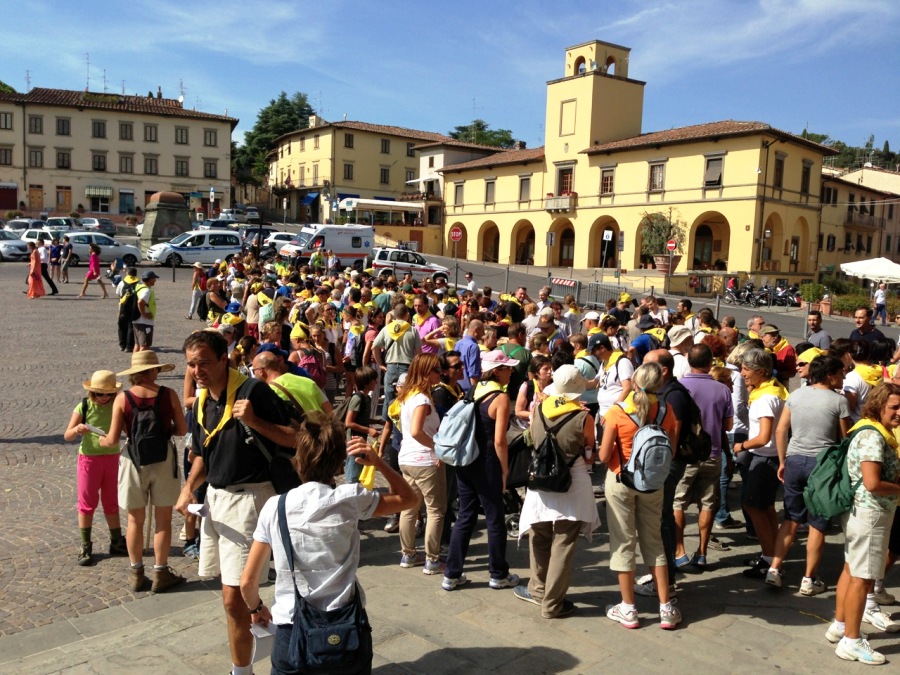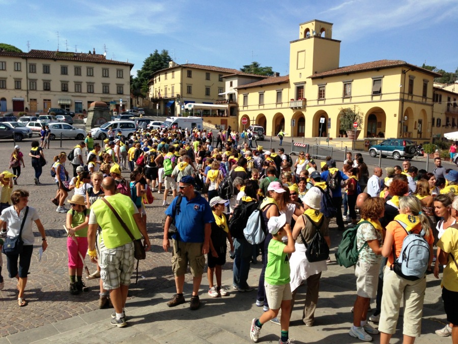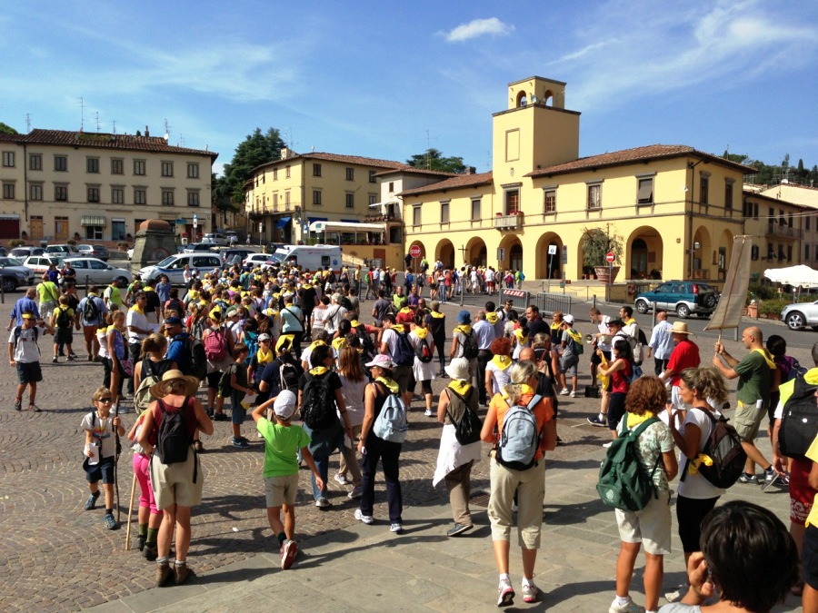 IMPRUNETA – La Santa Messa alle 15 e poi, sotto al sole cocente, l'inizio della lunga camminata che dal cuore di Impruneta, dalla Basilica di Santa Maria in piazza Buondelmonti, ha portato centinaia e centinaia di persone fino a Firenze, fra strade e viottoli, per incontrare il vescovo Giuseppe Betori in piazza Santissima Annunziata.