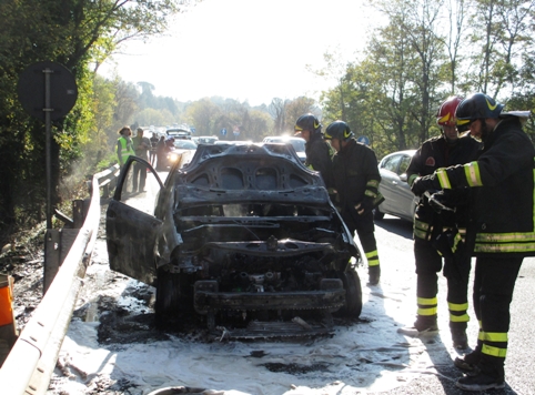 Il tempo di accostare l’auto e mettersi in sicurezza, mentre l’auto in pochi minuti è stata avvolta dalle fiamme. A dare l’allarme ai vigili del fuoco e aiutare gli occupanti, è stato un signore di San Casciano che da poco lontano ha assistito alla scena.