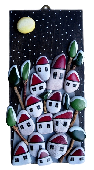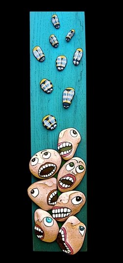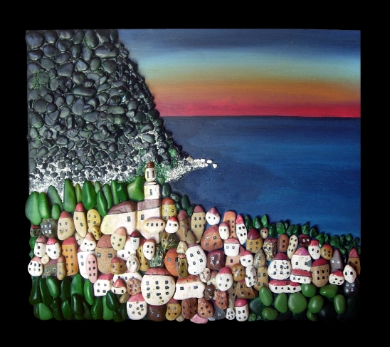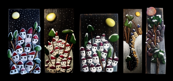 Piccoli mondi racchiusi su un sasso, su una pietra: volti, paesi, paesaggi, ombre e colori incredibili. Le opere di Michela Bufalini rimandano indietro nel tempo, con una classe unica e una vivacità incredibile ci fanno anche tornare bambini, a quando a scuola… ci facevano dipingere sui sassi.