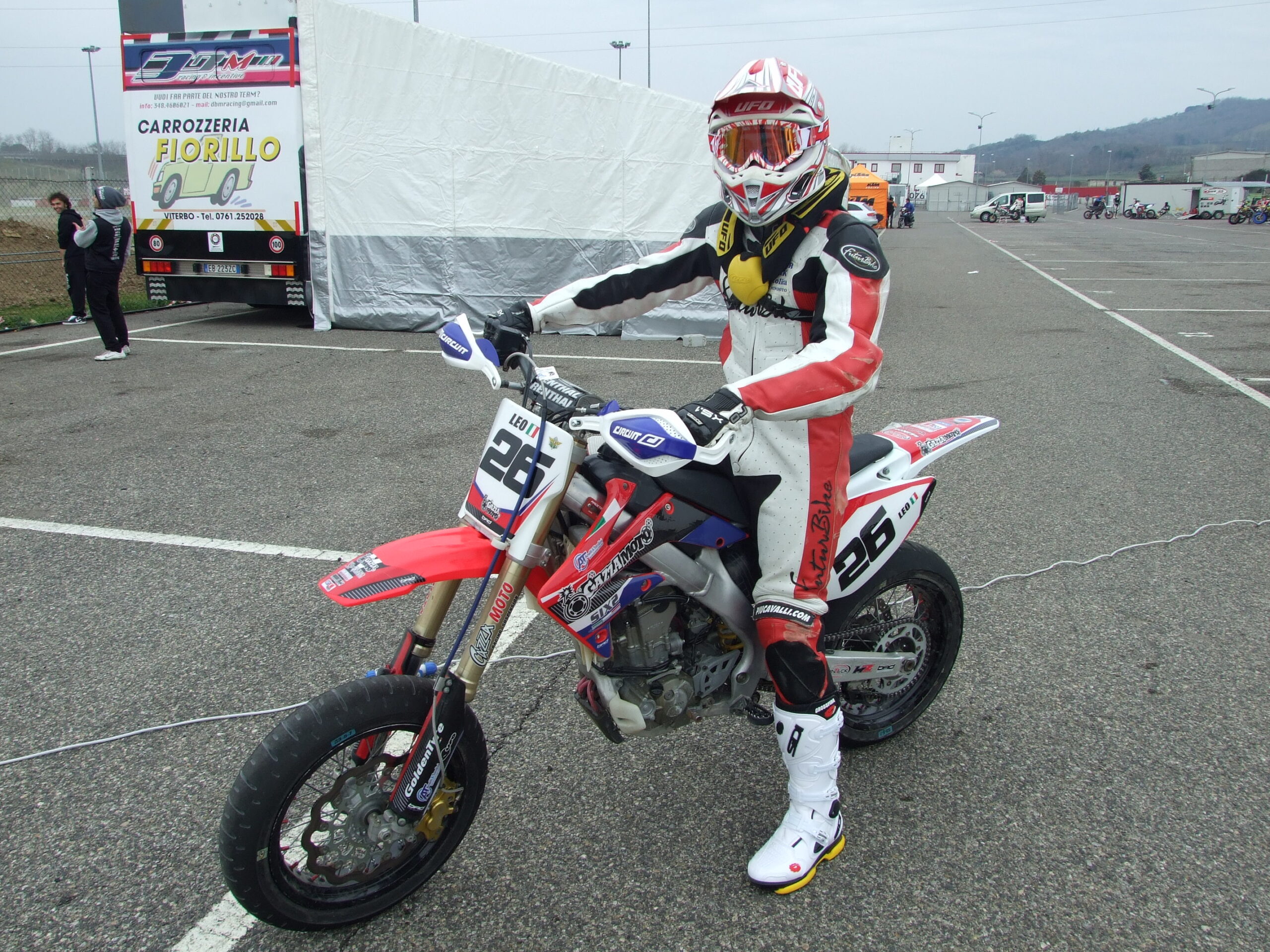 "Le Supermoto – spiega Leonardo – sono moto con telaio da cross, con sospensioni, cerchi e gomme da pista; le gare si sviluppano su circuiti di 1,5 km circa di asfalto e 500 m circa di sterrato, con salti e quant'altro. Pertanto sviluppiamo la velocità sulla pista e la tecnica nello sterrato raggruppato in un'unica gara".