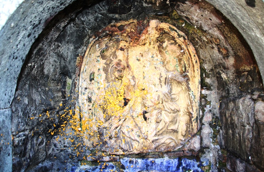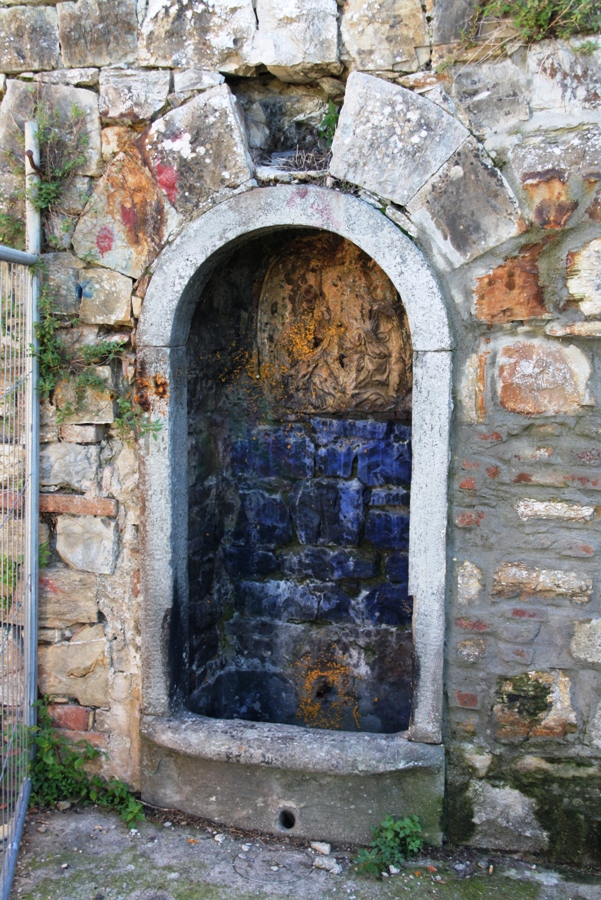 Questa immagine, imbrattata da vernice e altro, è posta all’interno di quella che una volta era una fonte d’acqua accanto a dei lavatoi, oggi recintanti poiché pericolanti.