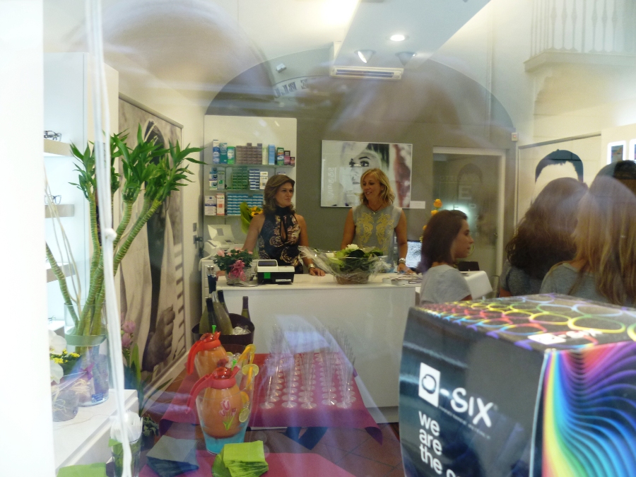 La vedete sorridente, nelle foto sopra, attorniata da clienti, amici, dalla collega Silvia Frittelli, con il vicesindaco (e assessore alle attività produttive) Joele Risaliti.