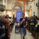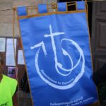 In testa la croce di legno portata a turno dai pellegrini e, accanto, lo stendardo con il logo dell’associazione disegnata nel 2016 da Caterina Morelli che rappresenta Maria che tiene in braccio il bambino Gesù e la freccia indica il cammino umano verso la redenzione.