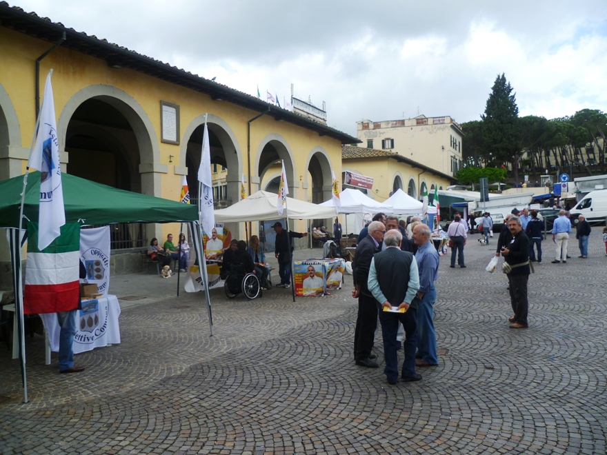 Mattinata da tutto esaurito quella di sabato 18 maggio in piazza Buondelmonti, a Impruneta: dove i cinque gazebo dei candidati a sindaco, perfettamente allineati di fronte ai Loggiati del Pellegrino, si sono riempiti di visitatori (anche prestigiosi…) a una settimana dal voto delle elezioni amministrative.
