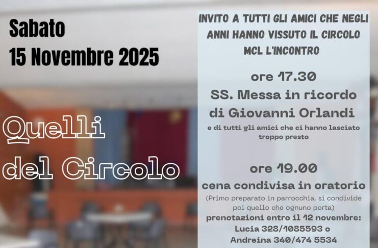 Questo è lo spirito con cui Laura Cioni ha organizzato per il 15 novembre la serata “Quelli del Circolo”, un momento conviviale aperto a tutti gli amici che negli anni hanno vissuto il circolo MCL “L’Incontro”.