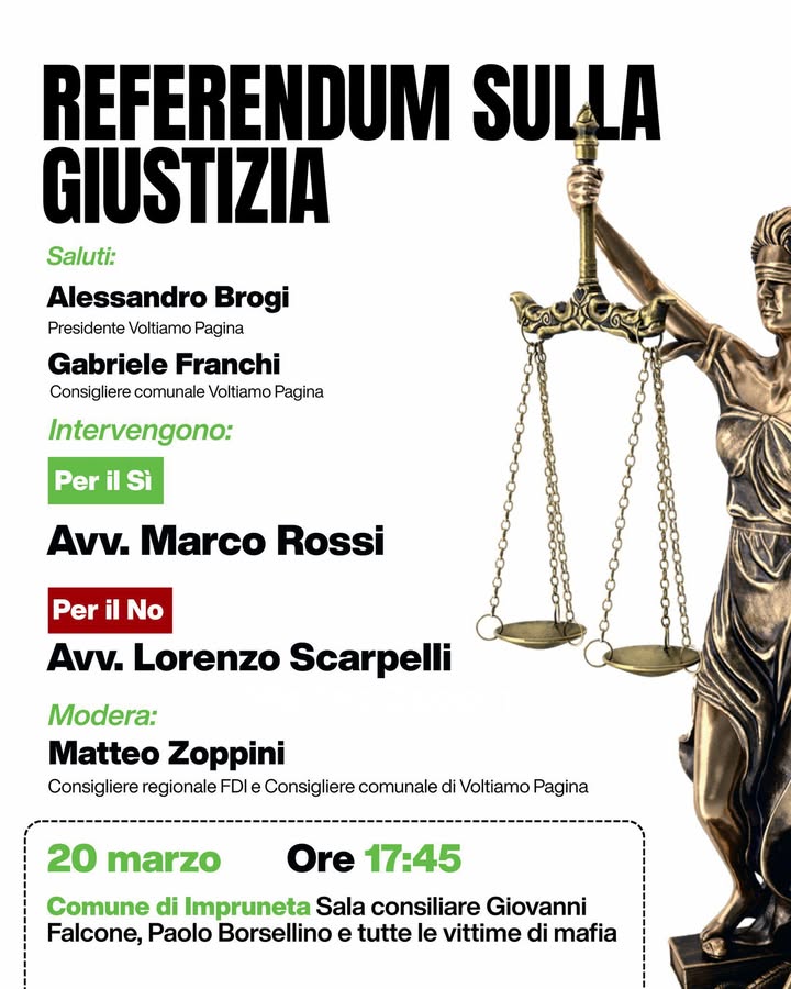 IMPRUNETA – In vista del referendum sulla giustizia, di domenica 22 e lunedì 23 marzo, il gruppo di opposizione Voltiamo Pagina Impruneta ha organizzato un incontro pubblico (venerdì 20 marzo in sala consiliare) per mettere di fronte le ragioni del sì e quelle del no (saranno espresse da due avvocati).