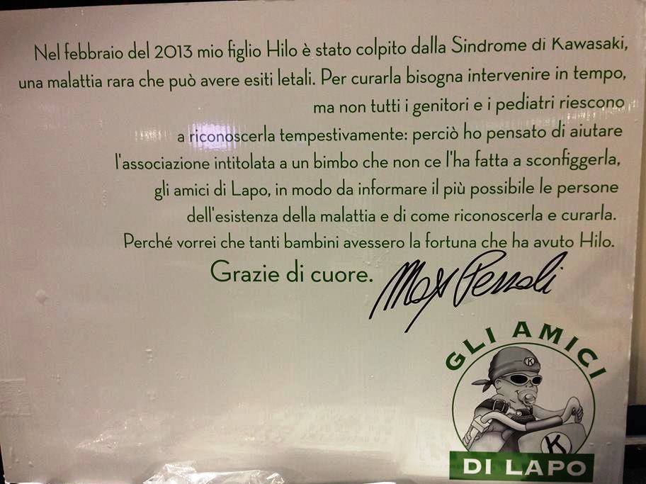 Un'associazione che, da adesso, ha anche l'appoggio di un personaggio sensibile come Max Pezzali. Per sostenere la lotta contro la Sindrome di Kawasaki si possono acquistare le magliette in tutti i suoi concerti. P.S.: il 30 novembre sarà al Mandela Forum a Firenze… .