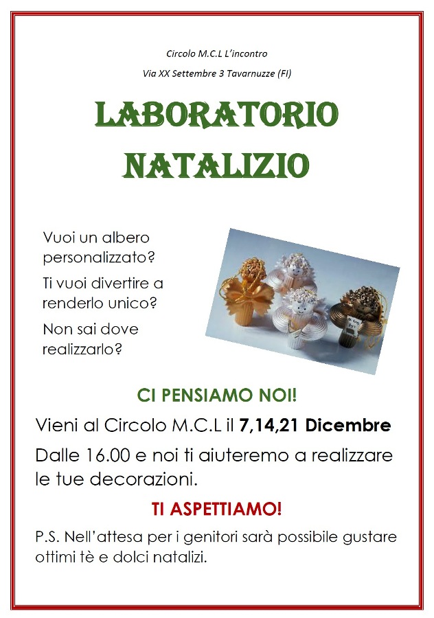 Sabato 21 dicembre dalle 16 alle 18 all'interno del circolo Mcl L'Incontro, Andrea e Eleonora allestiranno un laboratorio natalizio e aiuteranno i bambini a costruire decori di Natale. Nell'attesa per i genitori sarà possibile gustare ottimi tè e dolci natalizi.