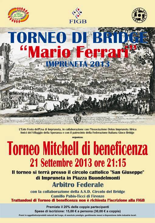L'associazione onlus Impruneta Africa – Amici del Villaggio della Speranza, in collaborazione con l'Ente Festa dell'Uva e il patrocinio della Federazione Italiana Gioco Bridge, organizza infatti il "Torneo Mitchell" di beneficenza, previsto per le 21.15 (di sabato 21 settembre appunto) sui tavoli del Circolo Cattolico San Giuseppe.