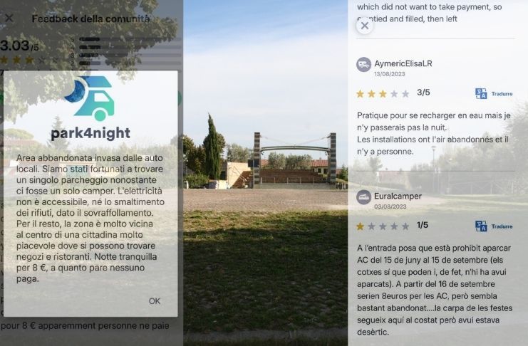 Su una applicazione apposita per i camperisti (Park4night), dove sono segnalate tutte le aree di parcheggio, essa viene segnalata dai turisti con recensioni molto negative.