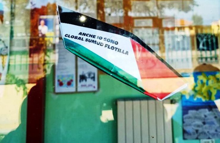 A Strada in Chianti nella locale scuola statale primaria sono stati affissi dall’interno nei vetri degli adesivi con la bandiera della Palestina e la scritta “Anche io sono Global Sumod Flottilla”.