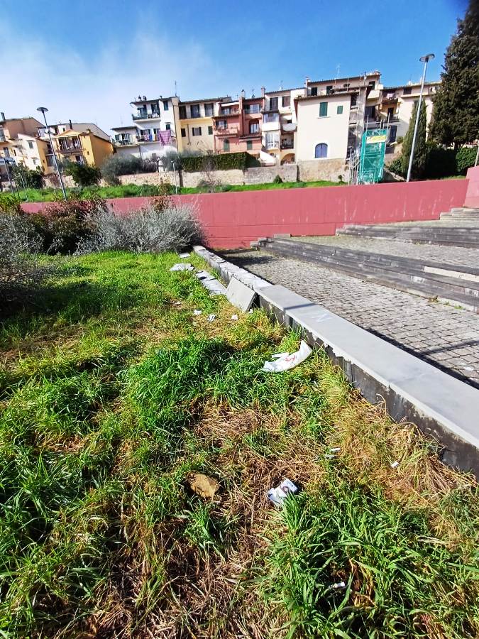Dopo aver fatto, da parte del Comune, una riqualificazione ai parcheggi sottostanti l’area Stianti, ho trovato domenica mattina (1 febbraio) la situazione come da foto nell’area sovrastante il parcheggio, ovvero il giardino e il piazzale che porta all’ascensore.
