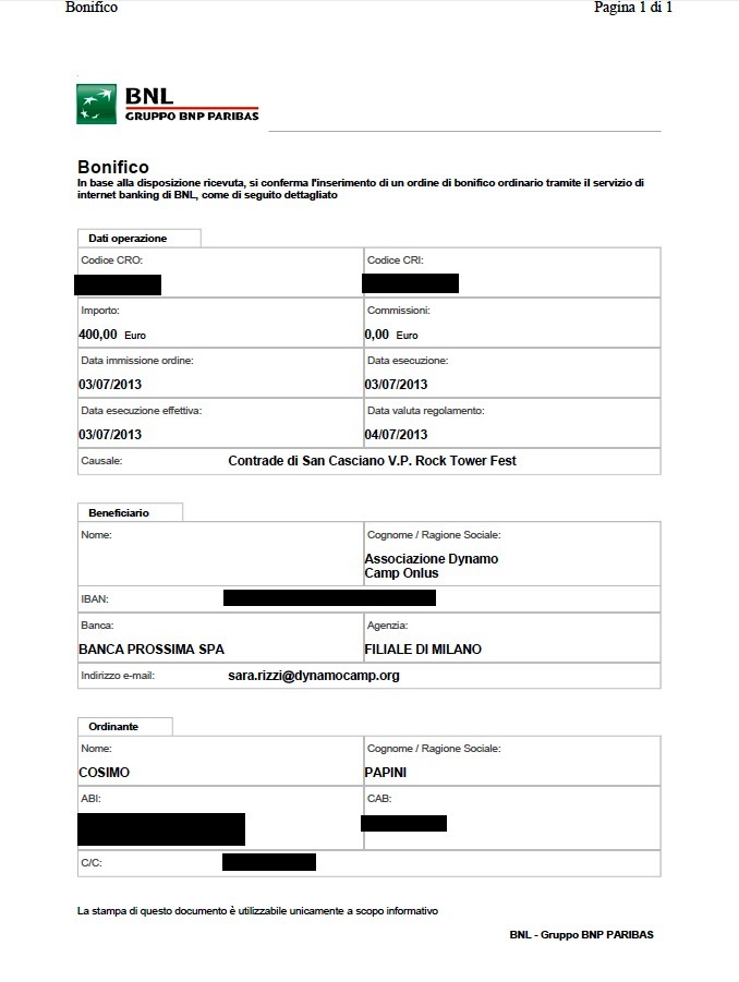 SAN CASCIANO – Per il massimo della trasaparenza e della correttezza, la contrada sancascianese della Torre ha inviato al Gazzettino del Chianti (che ben volentieri lo pubblica qui sopra) il bonifico che attesta la destinazione di 400 euro ricavati dal Rock Tower Fest (e dalle donazioni delle altre contrade) al Dynamo Camp (clicca qui per saperne di più su questa splendida realtà, questo campo estivo per bambini gravemente malati).