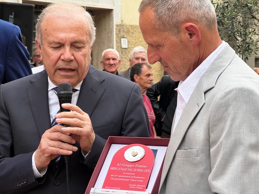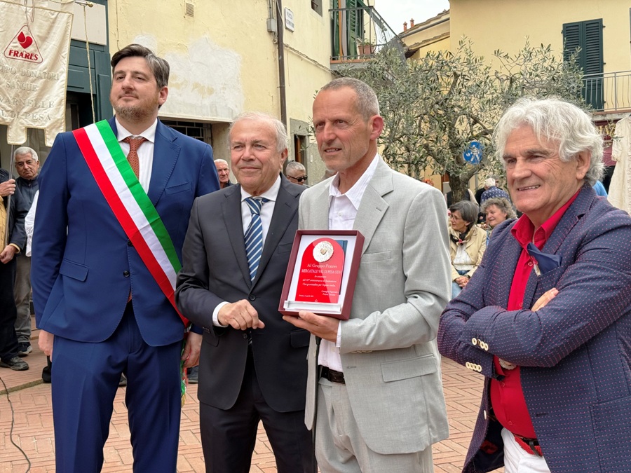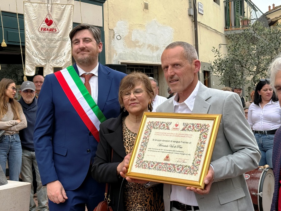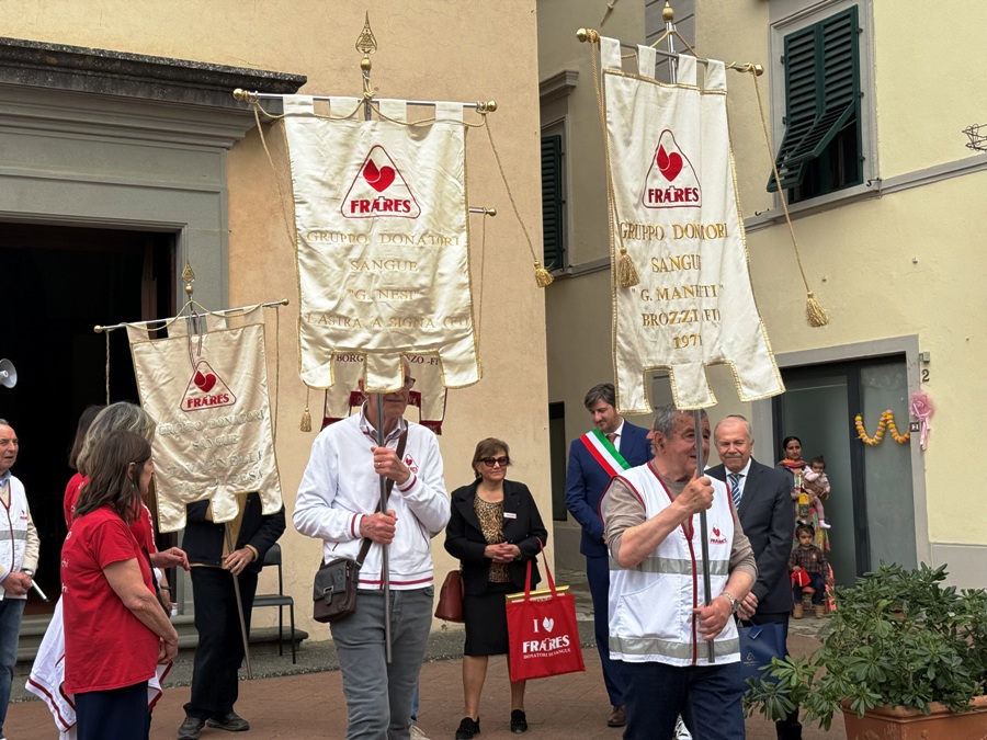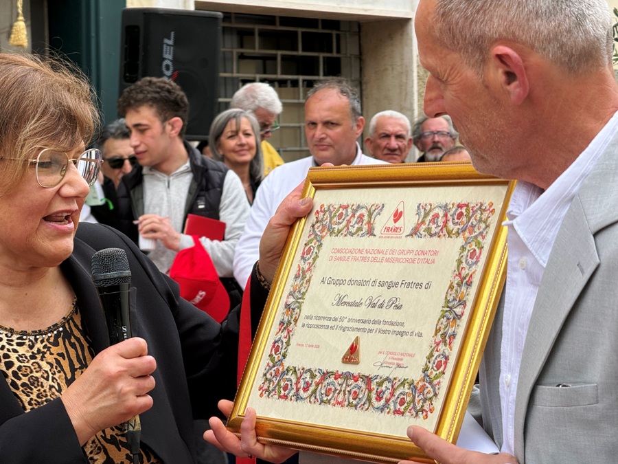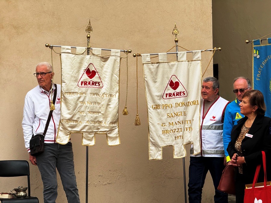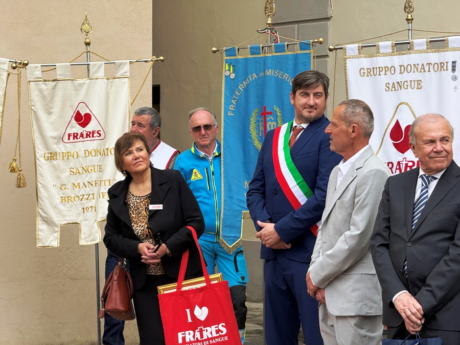 La quale, oltre ai saluti, ha consegnato al presidente Piazzini una targa con la medaglia Fratres in oro. Ha fatto lo stesso il presidente Giuseppe Di Pietro, presidente di Fratres Toscana e Alessandro Gavagni, del territoriale di Firenze.