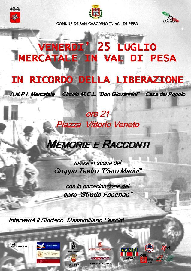 Venerdì 25 luglio alle 21 a Mercatale in piazza Vittorio Veneto A.N.P.I. Mercatale, Circolo M.C.L. "Don Giovannini" e Casa del Popolo propongono lo spettacolo "Memorie e racconti" messo in scena dal Gruppo Teatro "Piero Marini" con la partecipazione del coro "Strada Facendo".