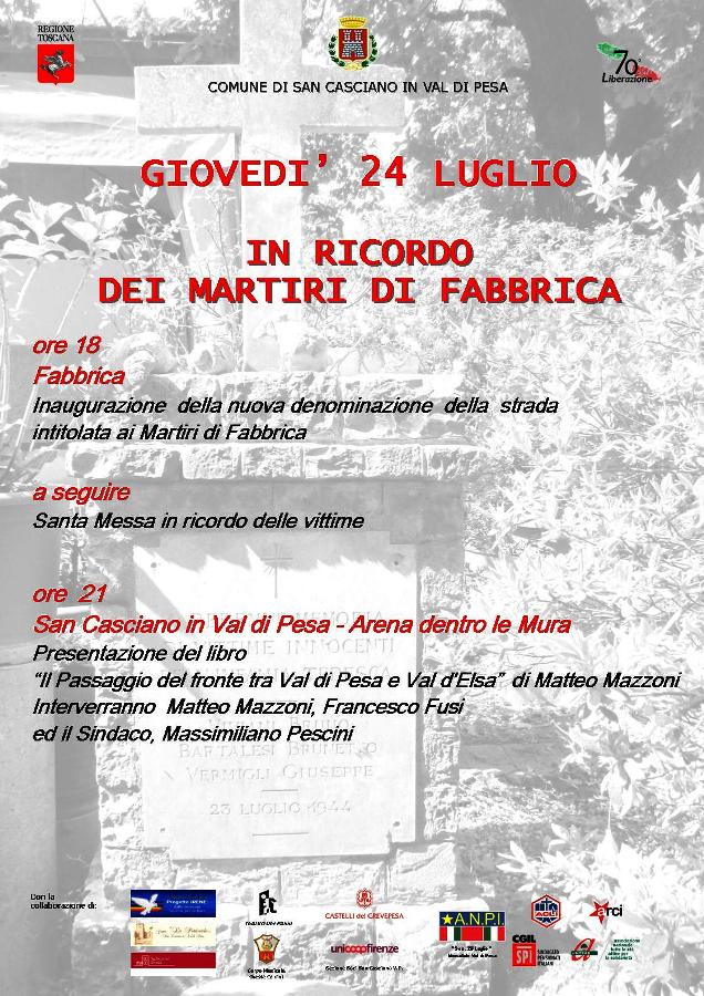 Giovedì 24 luglio alle 18 in località Fabbrica sarà inaugurata la nuova denominazione della via intitolata ai "Martiri di Fabbrica", nel luogo dove il 24 luglio 1944 furono fucilati Bruno Viviani, Brunetto Bartalesi e Giuseppe Vermigli; a seguire si terrà una Messa in suffragio delle vittime.