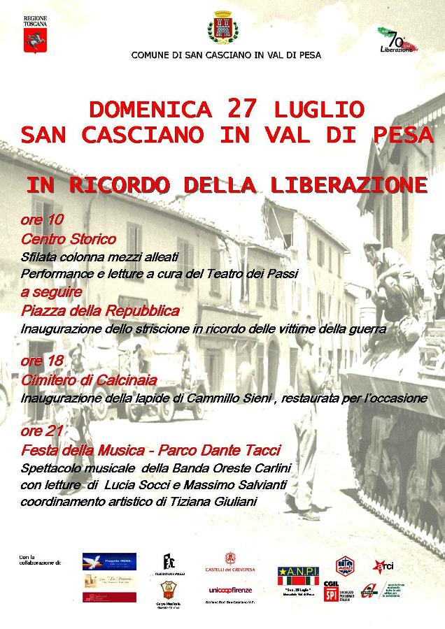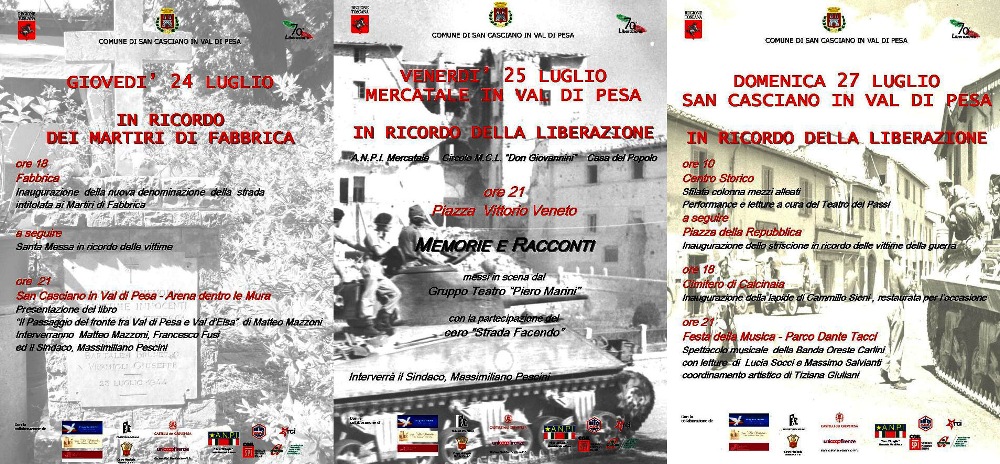 Domenica 27 luglio alle 10 a San Casciano sfilata di mezzi storici Alleati con performance e letture a cura del Teatro dei Passi; a seguire in Piazza della Repubblica sarà inaugurato uno striscione in ricordo delle vittime della guerra.