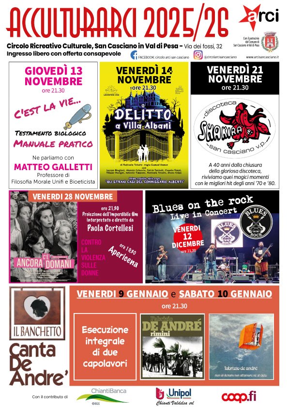 SAN CASCIANO – Al circolo Arci di San Casciano parte l’edizione dell’autunno 2025 del contenitore culturale AcculturARCI che andrà avanti fino all’inizio di gennaio 2026 con tanti appuntamenti per tutte le passioni: cinema, teatro, musica, dibattiti.