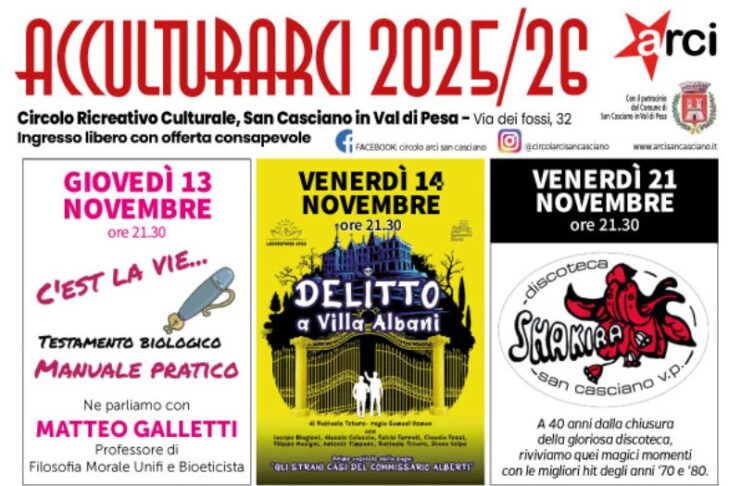 SAN CASCIANO – Al circolo Arci di San Casciano parte l’edizione dell’autunno 2025 del contenitore culturale AcculturARCI che andrà avanti fino all’inizio di gennaio 2026 con tanti appuntamenti per tutte le passioni: cinema, teatro, musica, dibattiti.