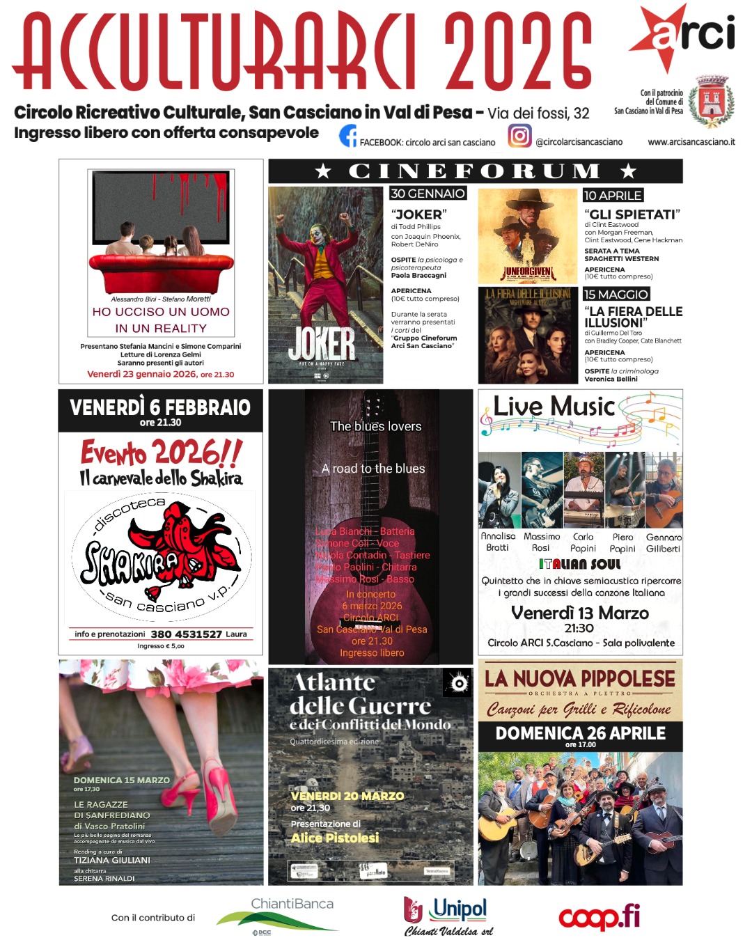 L’ingresso, dove non specificato, è libero con offerta consapevole. La rassegna è patrocinata dal Comune di San Casciano e supportata da ChiantiBanca, UnipolSai e Unicoop Firenze.