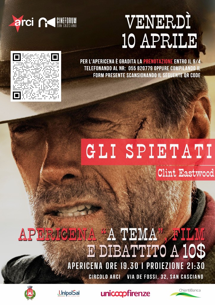 A seguire ci sarà la proiezione de “Gli Spietati”, western femminista diretto e interpretato da Clint Eastwood dove l’attore e regista californiano è affiancato da attori del calibro di Gene Hackman, Morgan Freeman e Richard Harris.