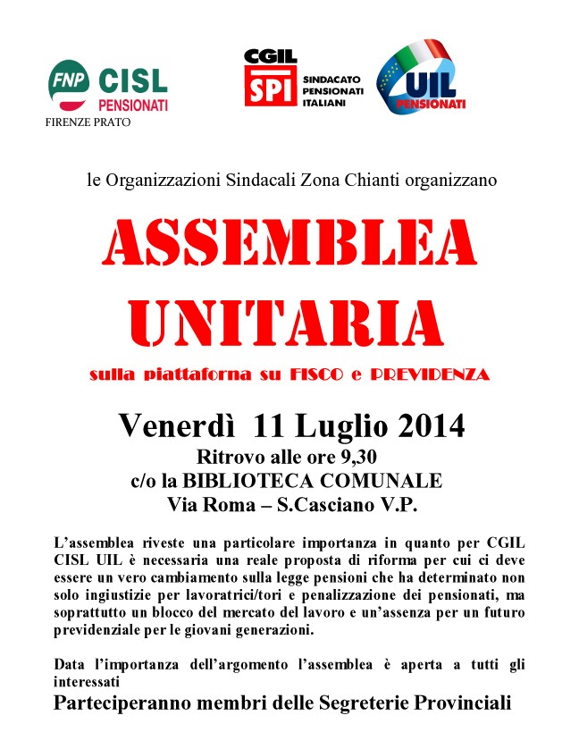 SAN CASCIANO – Assemblea unitaria delle organizzazioni sindacali pensionati della zona Chianti (Cisl Pensionati, Uil Pensionati, Spi Cgil): inizierà nella matitna di oggi, alle 9.30, presso la biblioteca di via Roma a S.Casciano.