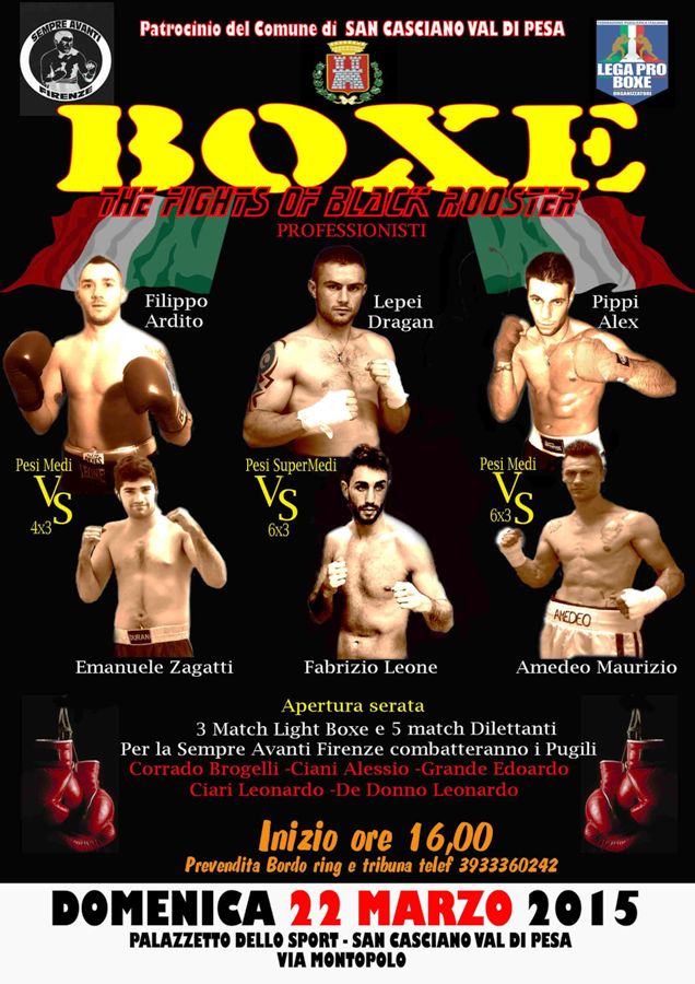 L'hanno chiamato, in omaggio al territorio ospitante, "The fight of Black Rooster" (la battaglia del Gallo Nero). Apertura della serata con tre match di light boxe e cinque match di dilettanti. Poi i professionisti.