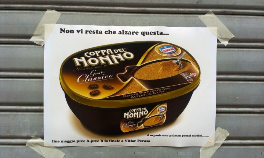Una bella Coppa del Nonno come foto con scritto "Non vi resta che alzare questa… si organizzano pullman a prezzi modici, fine maggio, Juve A-Juve B a Villar Perosa".