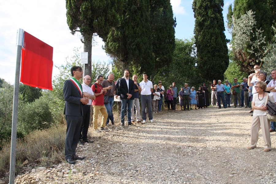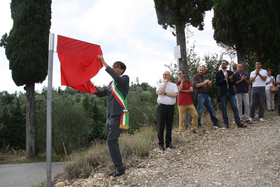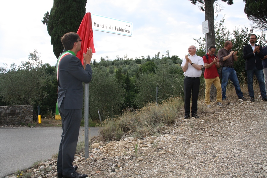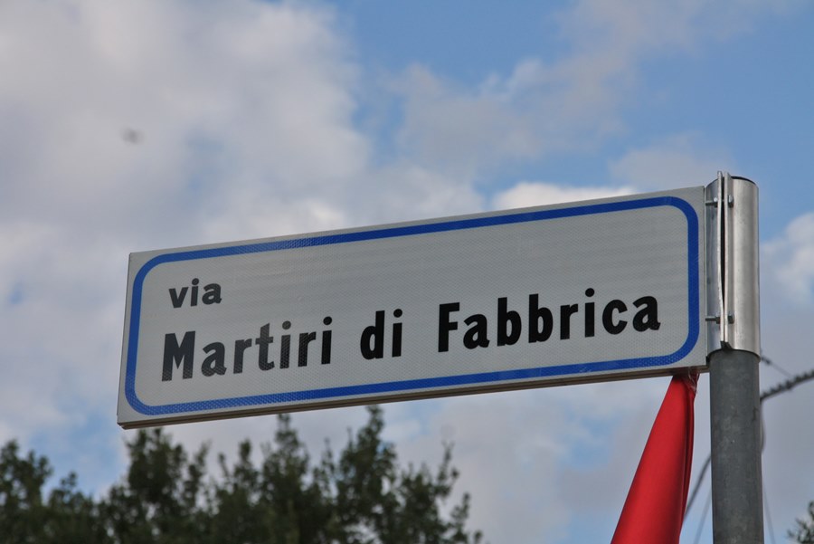 FABBRICA-MERCATALE (SAN CASCIANO) – La breve strada sterrata di fronte a Fabbrica, che conduce al monumento dedicato ai tre mezzadri uccisi il 24 luglio del '44 dai tedeschi (clicca qui per leggere l'articolo), dal 24 luglio di 70 anni dopo (giovedì scorso) ha preso il nome di via Martiri di Fabbrica.
