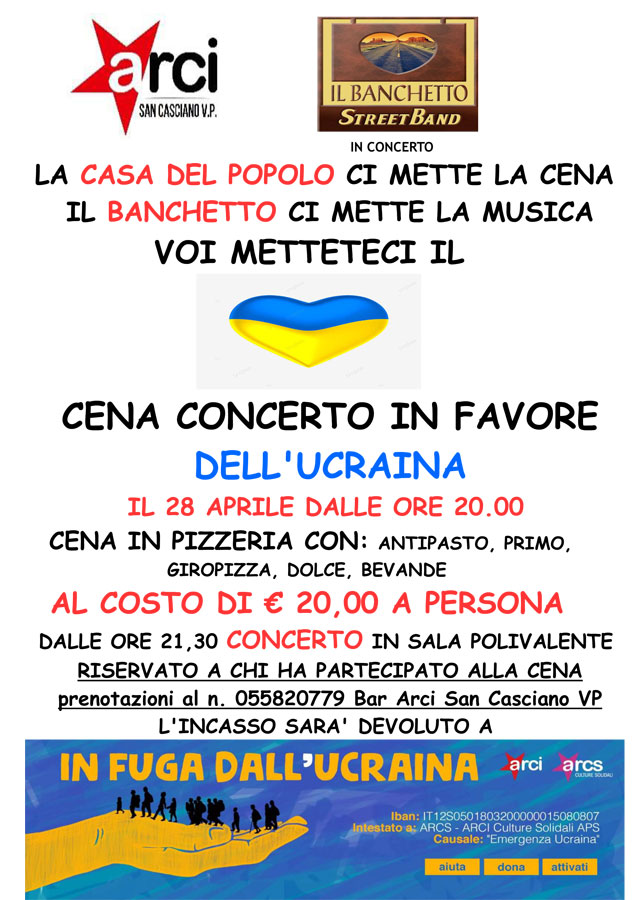 “Come circolo Arci San casciano – ricorda il presidente Malquori – abbiamo già effettuato una raccolta fondi l’otto marzo, per la Festa della Donna, devolvendo alla Croce Rossa Italiana impegnata in Ucraina l’intero incasso della cena”.