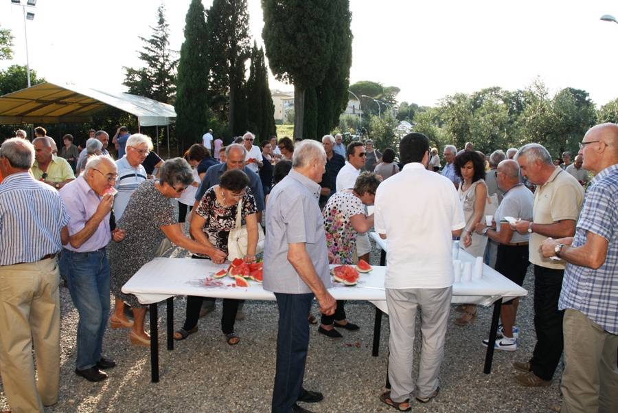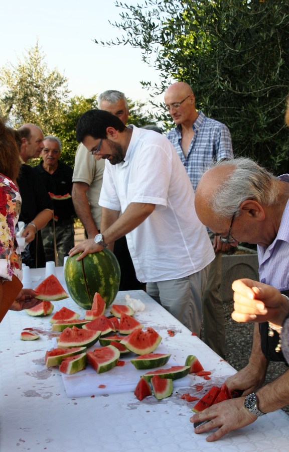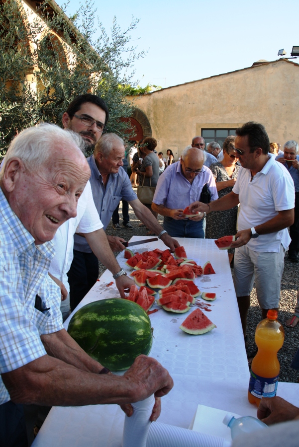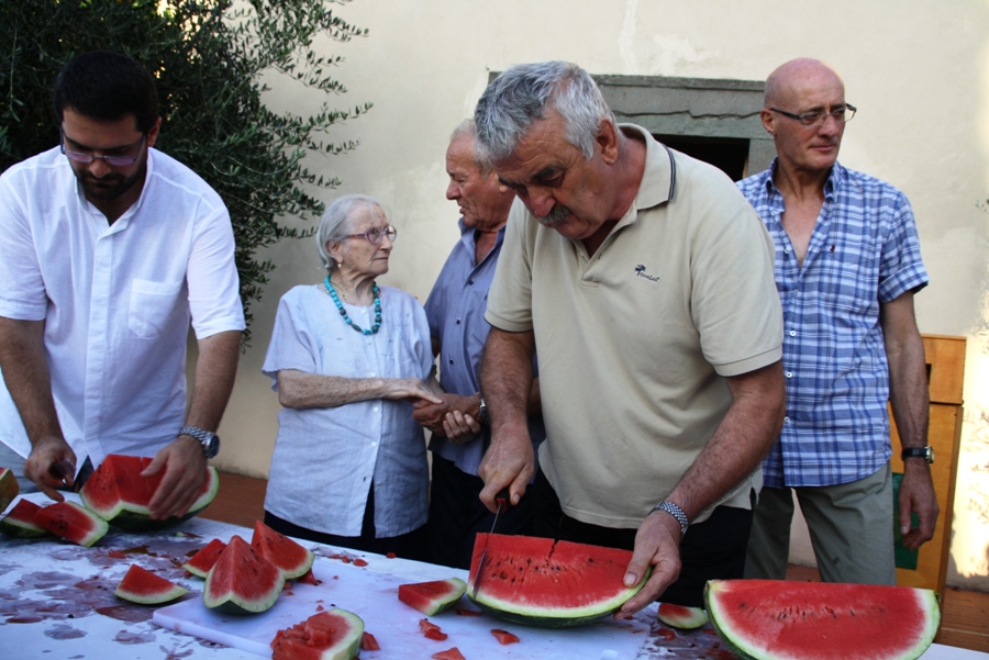 Alla fine della cerimonia tutti insieme sul piazzale della pieve per festeggiare anche San Lorenzo, e come da tradizione il sacrestano Renzo si è prestato a distribuire gustosissime fette di cocomero fresco.