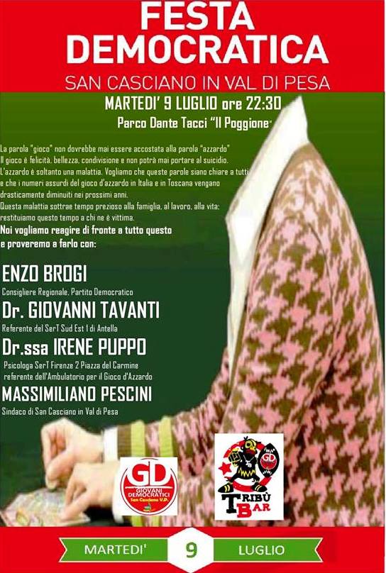 SAN CASCIANO – Un dibattito sul gioco d'azzardo: è quello che si svolgerà domani sera, martedì 9 luglio, alle 22.30 al Tribù Bar della festa del Pd al Parco "Dante Tacci" (Poggione), organizzato da Guido Gamannossi dei Giovani democratici di San Casciano.
