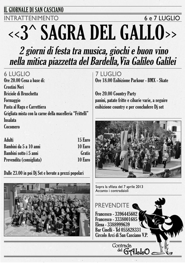 SAN CASCIANO – La contrada del Gallo mette in campo tutti i suoi "effettivi" e per sabato 6 e domenica 7 luglio organizza la terza "Sagra del Gallo", due giorni di festa fra musica, giochi e buon vino nella piazzetta del Bardella in via Galileo Galilei.
