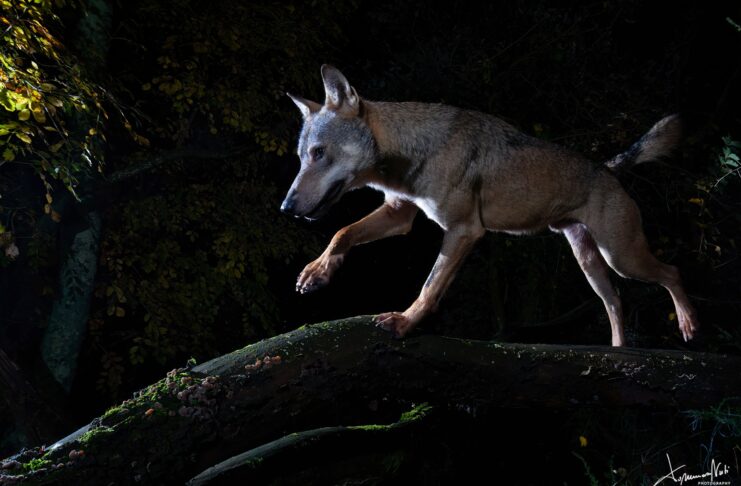 Ma veniamo… al lupo equilibrista: “C’è un punto in un bosco che, negli ultimi due o tre anni, è stato il set di numerose fotografie che ho realizzato. Un vecchio albero, caduto dopo un temporale su una recinzione, è diventato nel tempo un punto di passaggio per molti animali: volpi, caprioli, tassi, istrici e… lupi”.