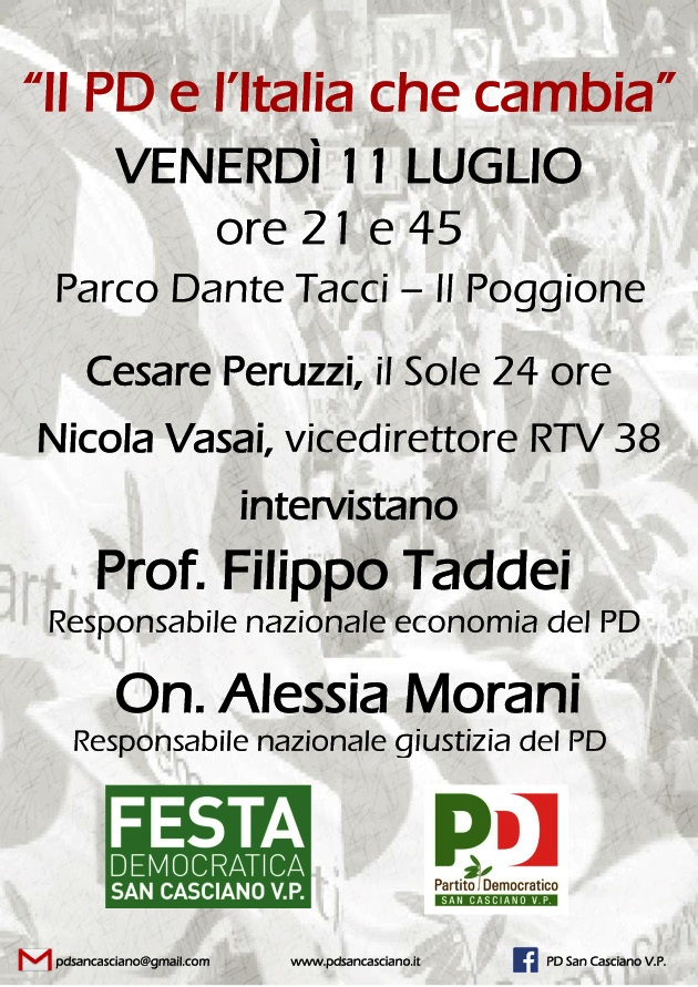 SAN CASCIANO – "Il Pd e l'Italia che cambia" è il titolo dell’iniziativa pubblica che si terrà presso la Festa democratica venerdì 11 luglio alle 21.45.