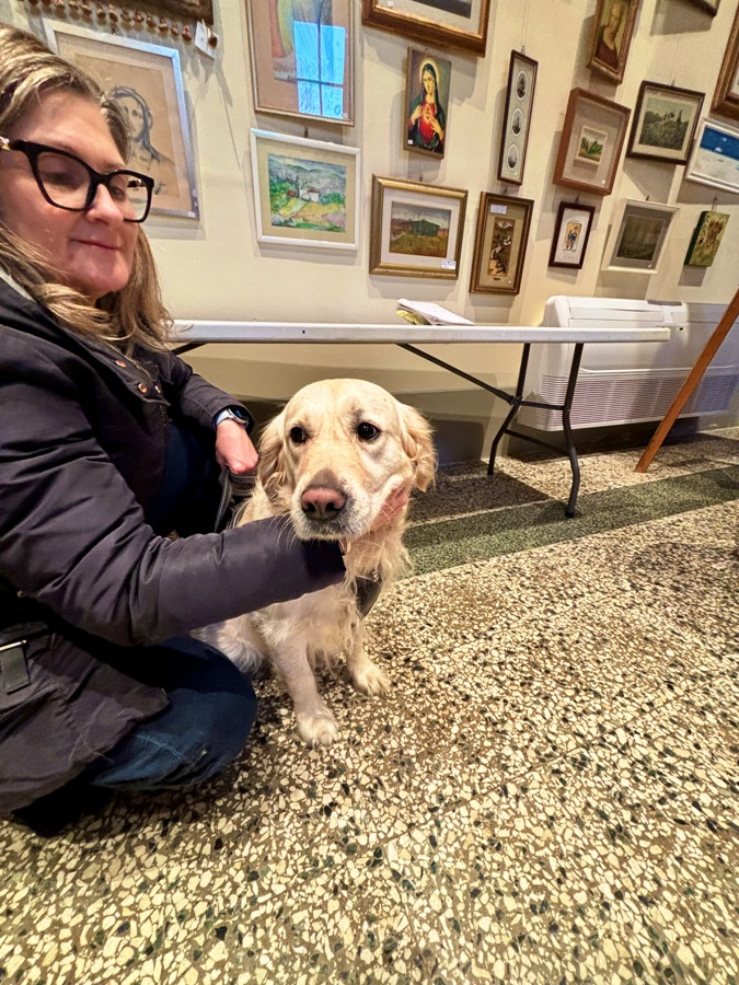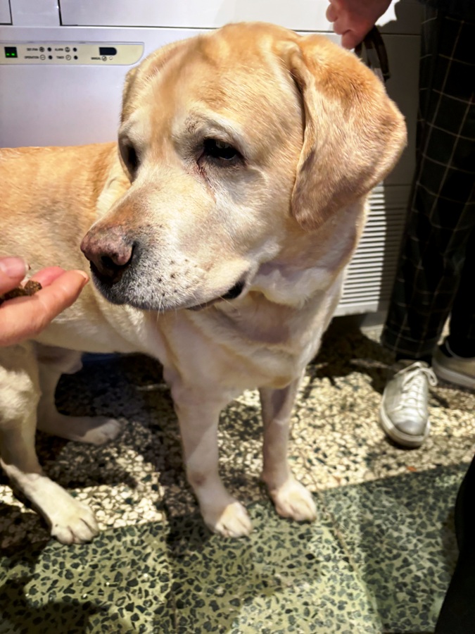 Maria è con Grinza, un Labrador di ben tredici anni al quale manca tantissimo il suo padrone Giorgio.