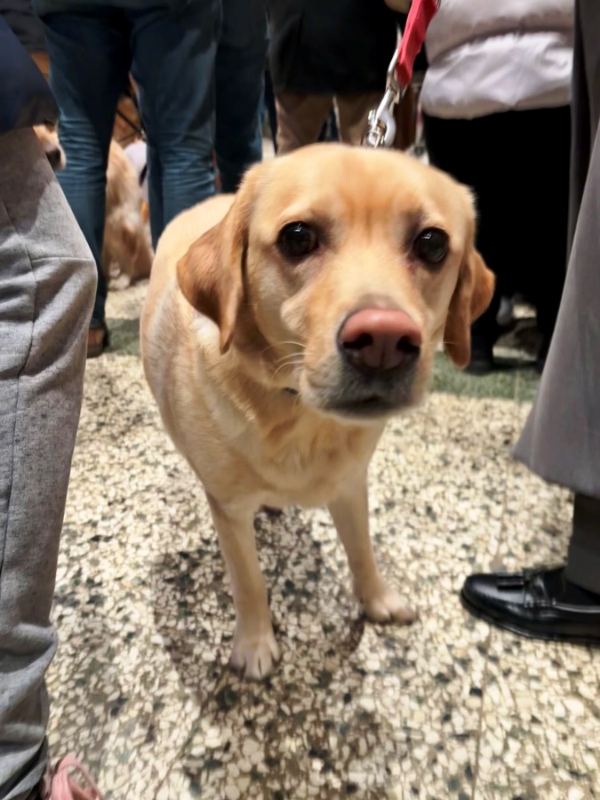 Un po’ in disparte troviamo un pastore maremmano, Lampo, che proprio il diciassette compie undici anni; accanto a lui c’è Gioia, una Labrador bionda proveniente dalla scuola cani guida di Scandicci che ha fatto anche la Pet Therapy.